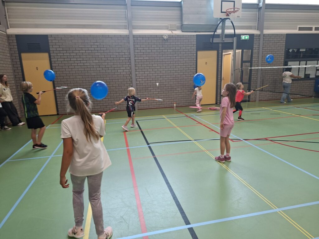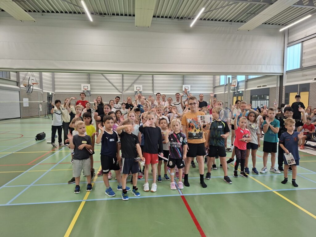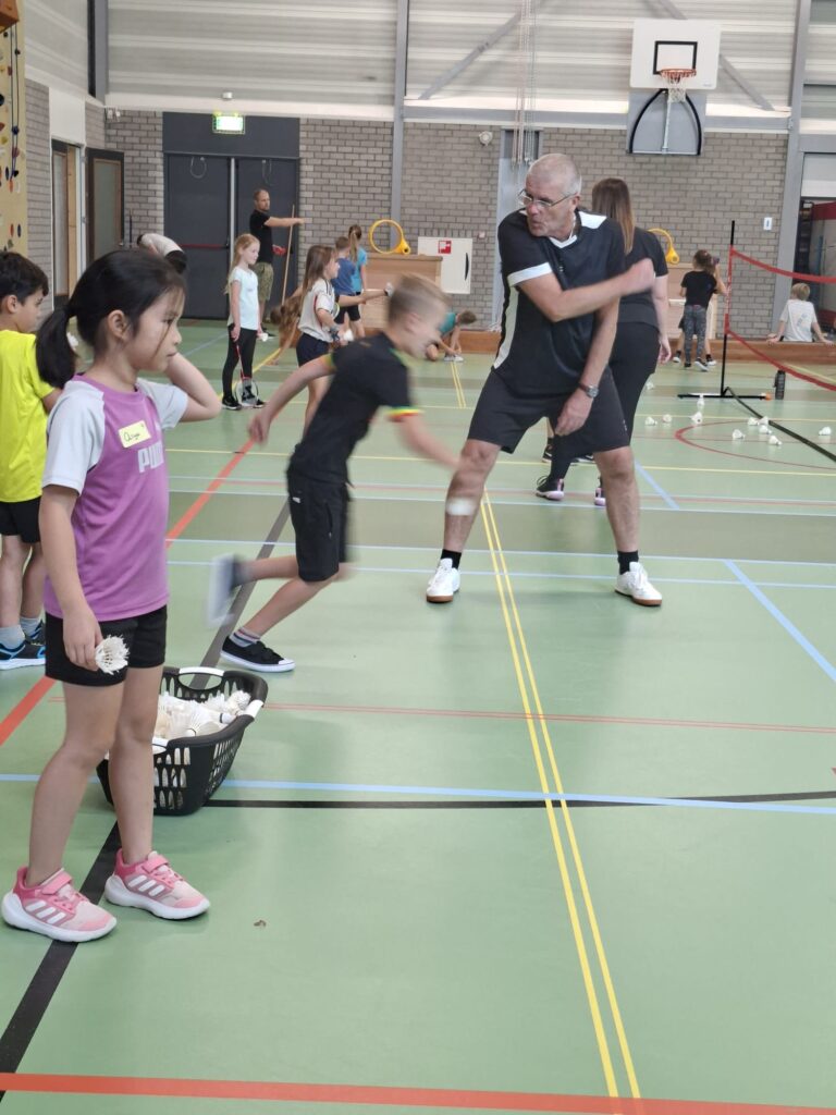 In verschillende groepjes speelden de kinderen fanatiek allerlei leuke badminton-spelletjes. Tussen de activiteiten door was er tijd voor een welverdiende pauze met limonade en een krentenbol.